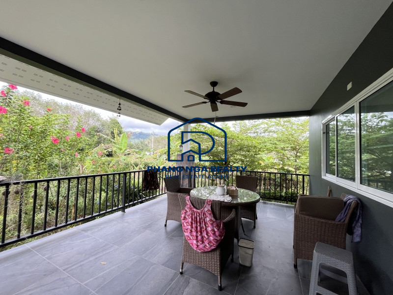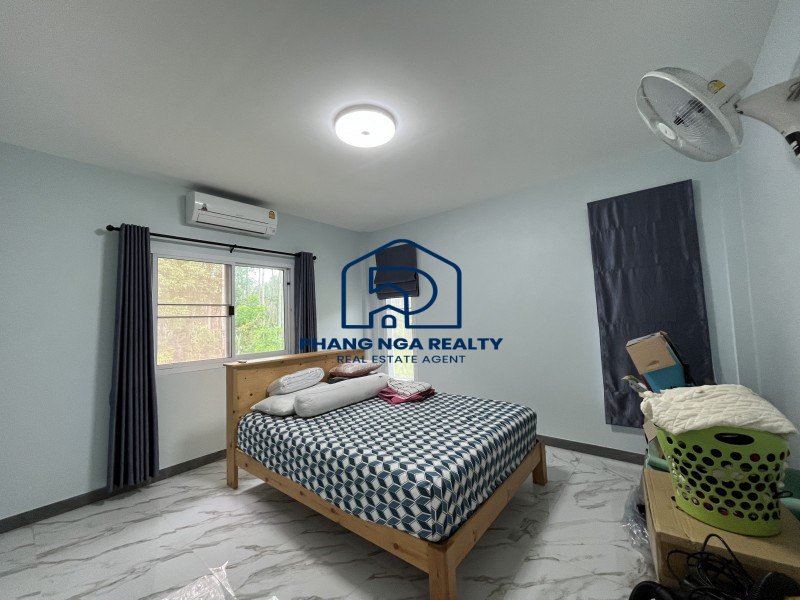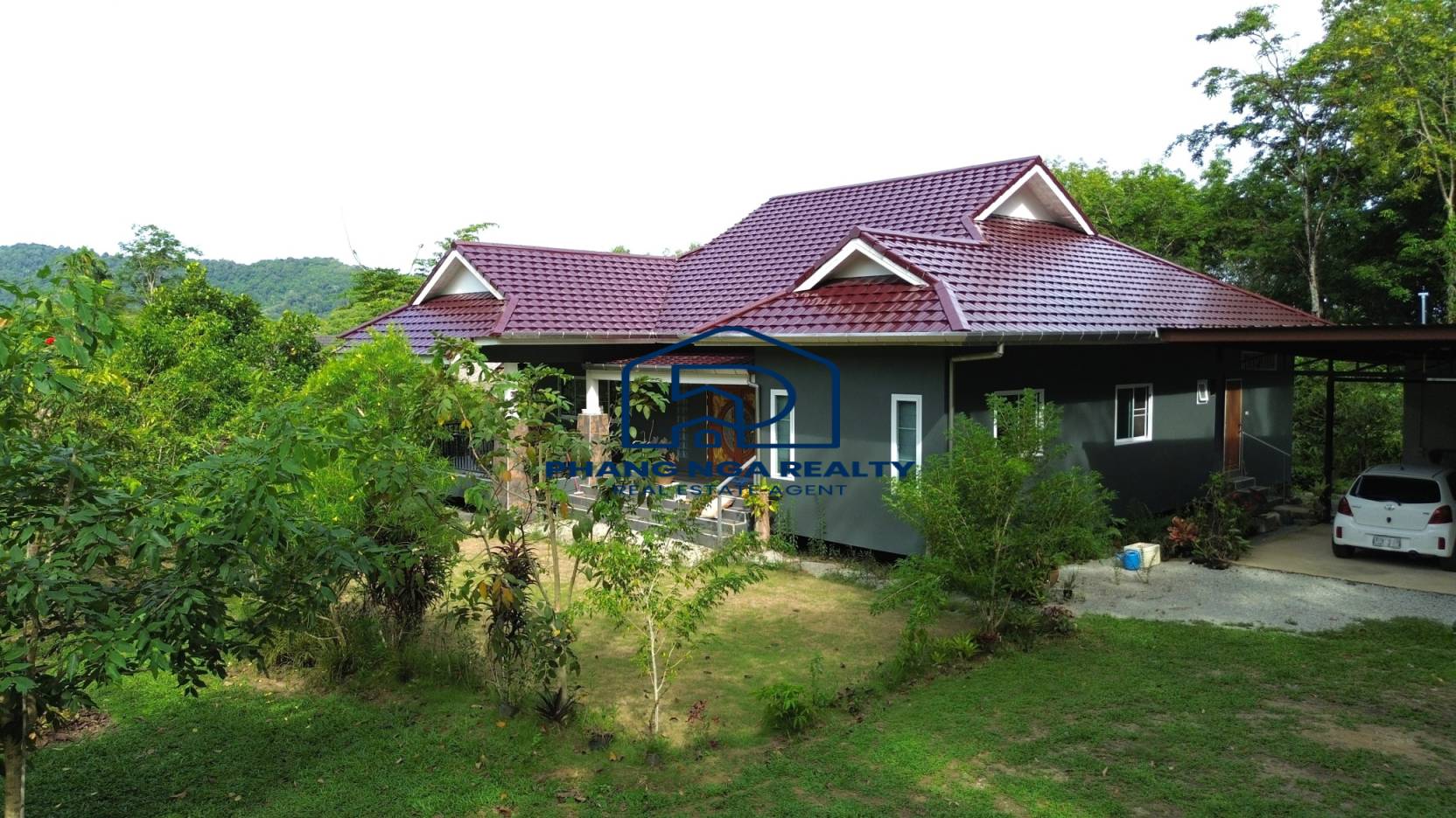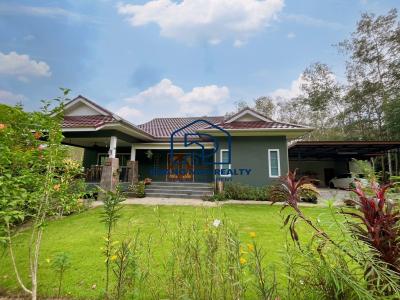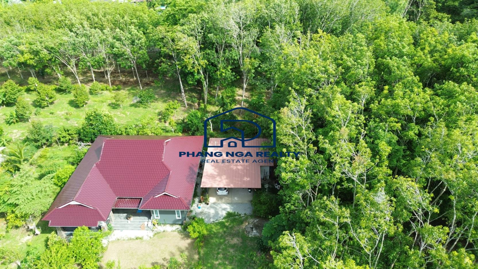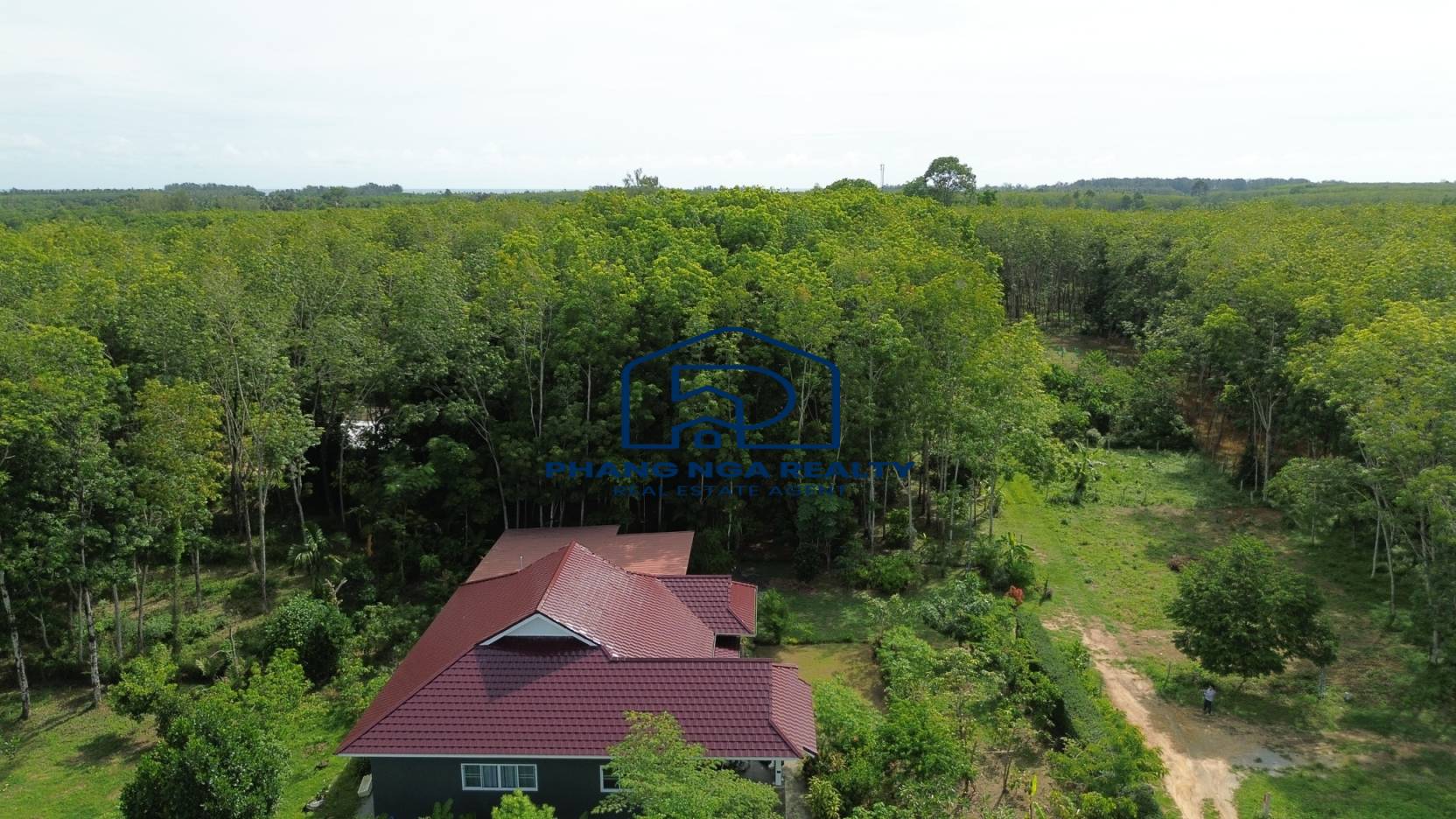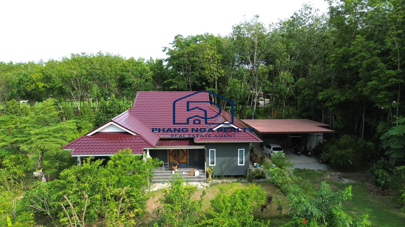 A new house in the garden is for sale in Phangnga. This property is located in a peaceful area between Natai Beach and Klok Koi Town. The house is strength, resilience, and quality. The carport for two cars connects to the house and has a storage room with a toilet inside. The house was built on 2,997.6 square meters. The usage size is 250 square meters. The layout of the house consists of 3 bedrooms, 2 bathrooms, a laundry area, a kitchen, and a living room. Dining area in the middle of the house. Outside living area with a large terrace to enjoy the green and shady garden. This property has more land 2,344.4 sqm with rubber plantations. It can build 2-4 houses for rent with a swimming pool. Electricity and water from a 10-meter-deep well are available. Ideal for a vacation home, retirement home, or investment in tourist accommodations.
