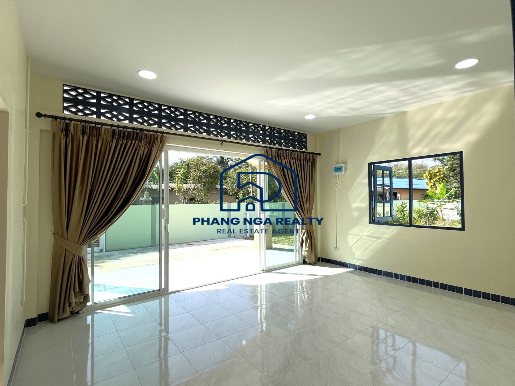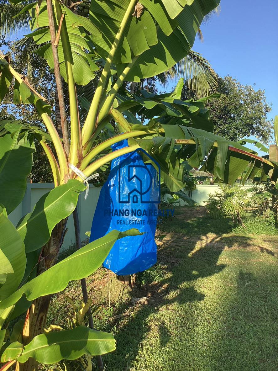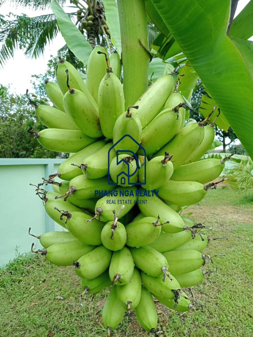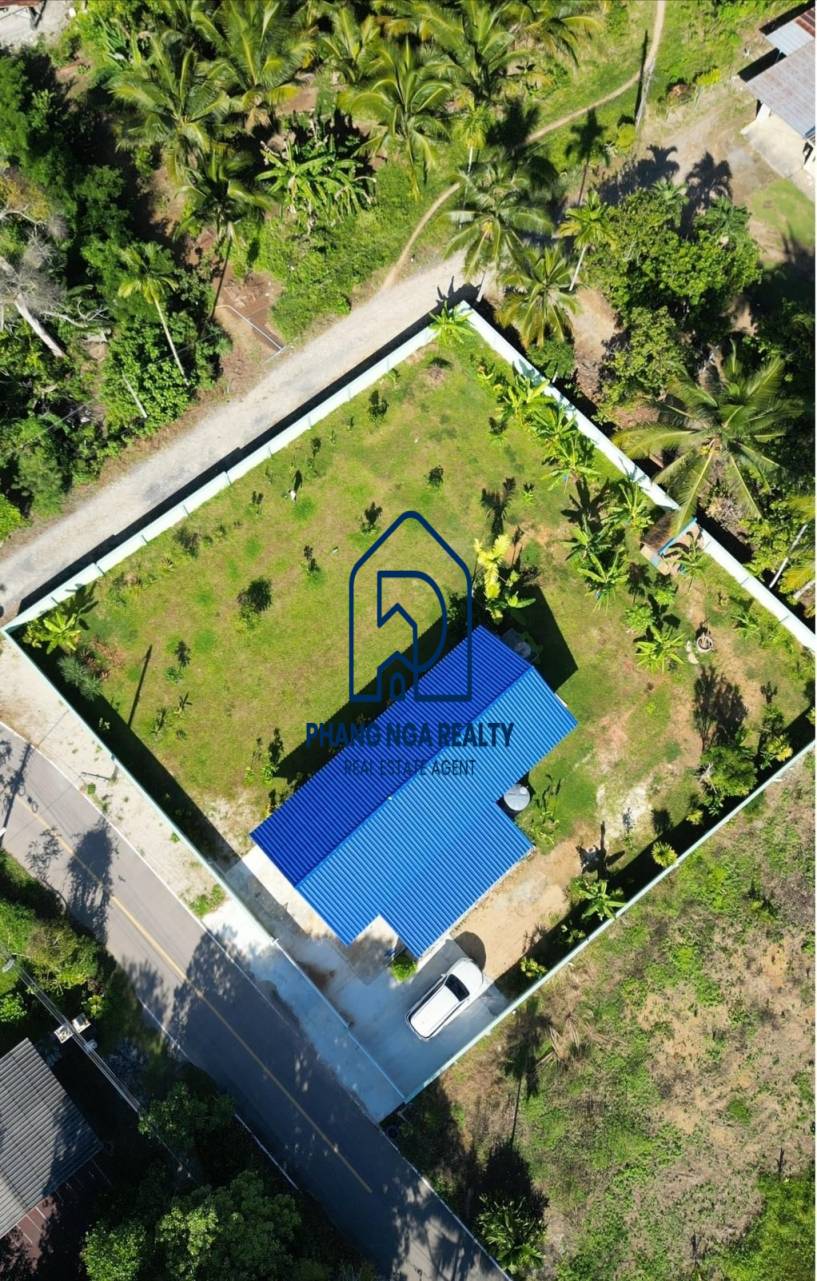 Two-bedroom detached house is for sale in a simple atmosphere in Khok Kloi, Phangnga; when opening the door, the first room you see is a living room with 2 bedrooms, 1 bathroom, and a kitchen. There is a garage for one car in a quiet alley near the community area. next to a public road About 500 meters from the main road, near community temples, hospitals, and schools, and not far from Natai Beach Suitable for those who love marine activities, cycling, or walking on the white sand beach. Swim in the clear sea and also near the waterfall. You can enjoy your favorite nature activities. The flat land is a garden with many fruit plants, such as banana trees and mango trees, as well as electricity, both Deep well water (15-20 meters deep) and Government water. Chanote owns the title deeds to the land, which is approximately 35 meters wide and 36 meters long. This is a golden opportunity for those who are interested in a home with a warm, simple atmosphere and cheap fruit orchards that should not be overlooked. close to nature, suitable for relaxation, can start a small business by opening a café.