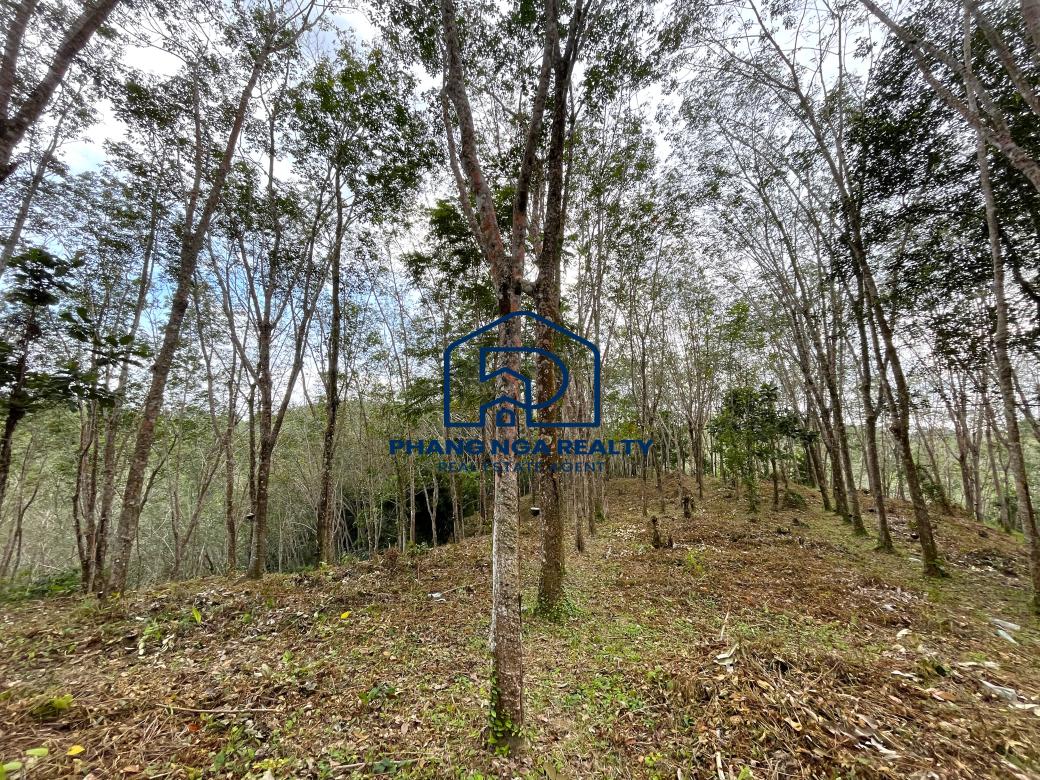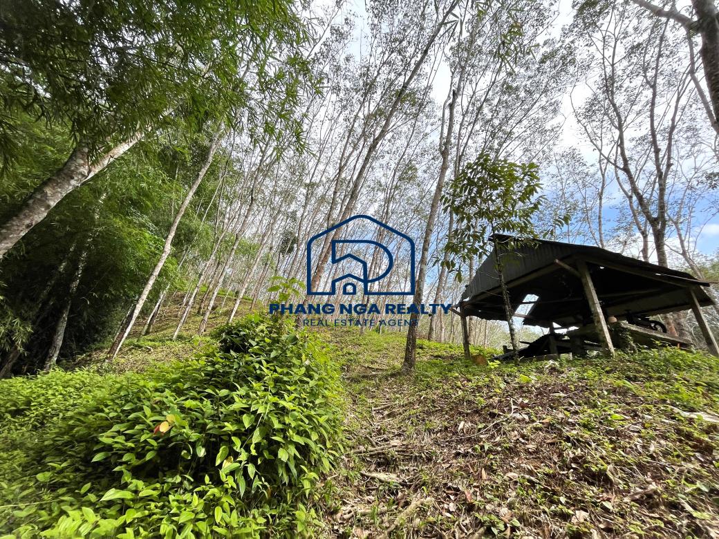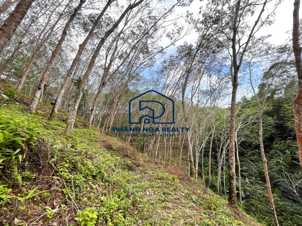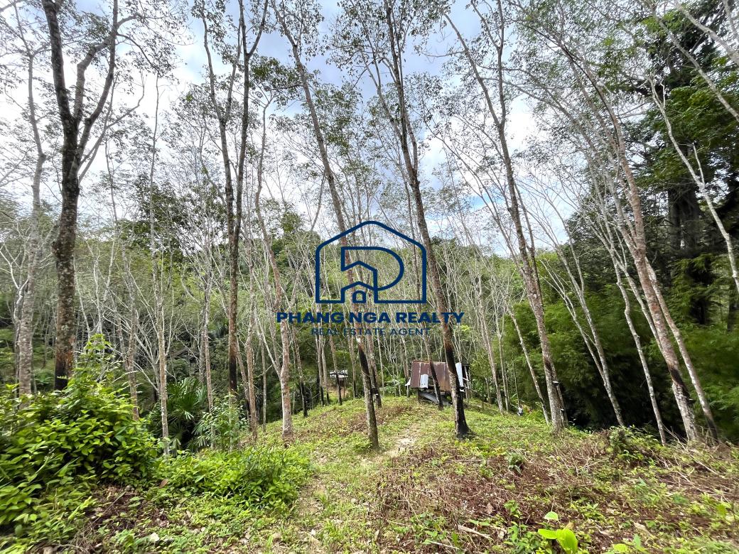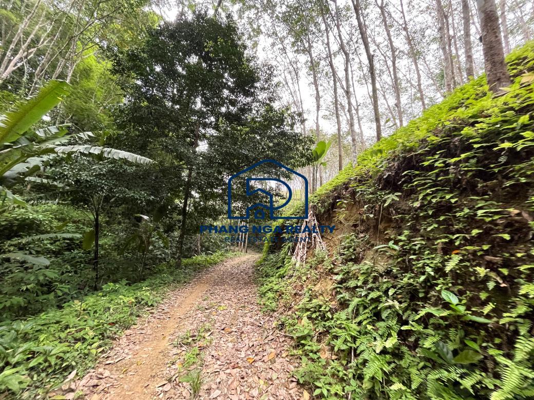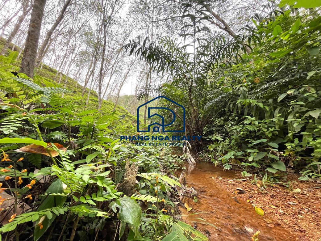 Hillside 15 Rai in the canyon next to the stream for sale in Tha Yu, Phangnga, has a rubber plantation adjacent to a stream on both sides of the land that features natural sounds and relaxation and a 6-meter-wide public road leading to the land plot. Available on a Norsor3 title. Electricity and water are accessible.