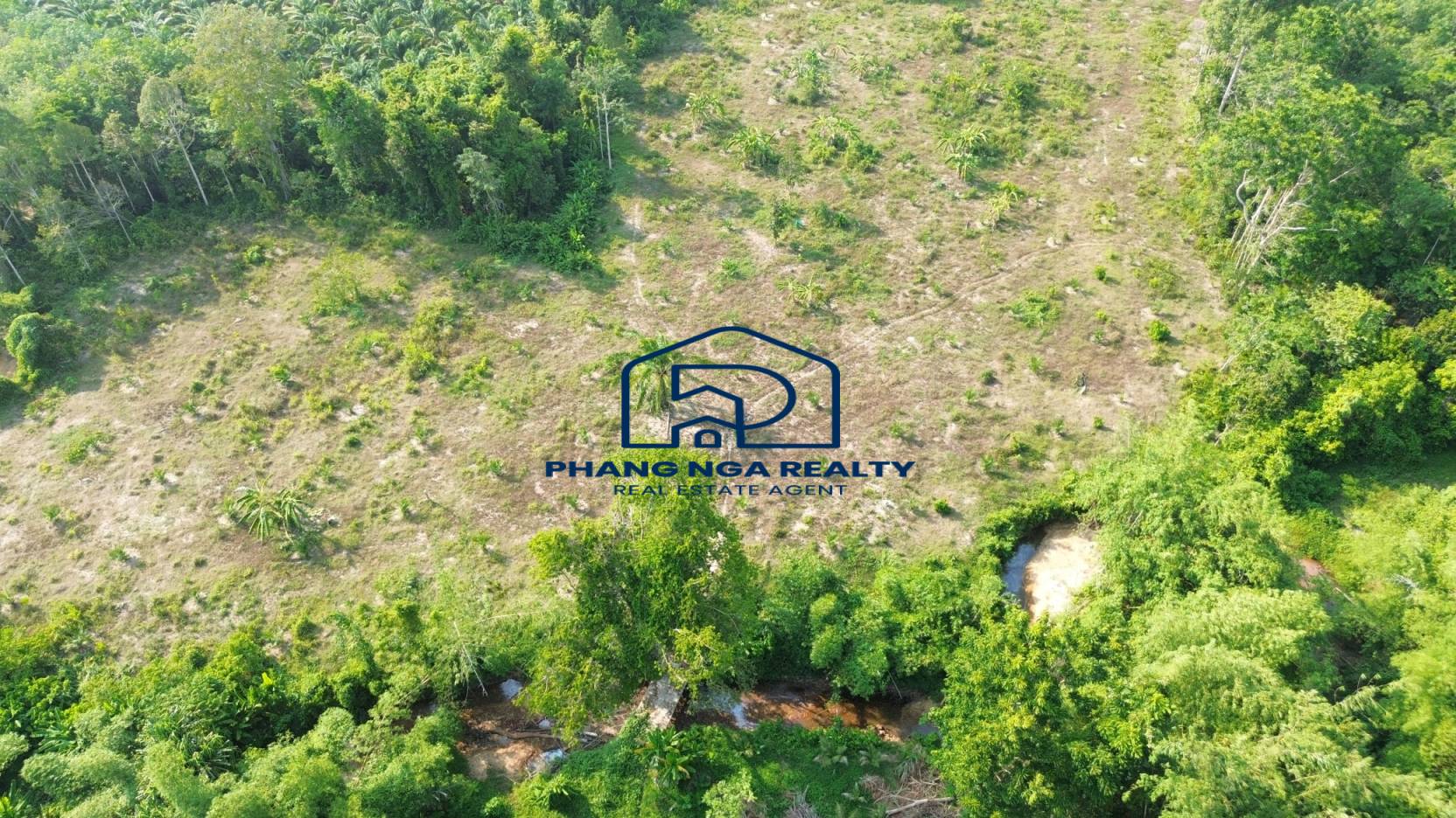 15-rai palm garden land in Thai Mueang, Phang Nga, with Nor Sor 3 Kor title deed. The land features flat areas and slight slopes. The entrance is a gravel road, 3 meters from the main road. Water supply and electricity are readily available, ensuring convenient transportation. Nearby, a bridge crosses a stream that flows year-round.