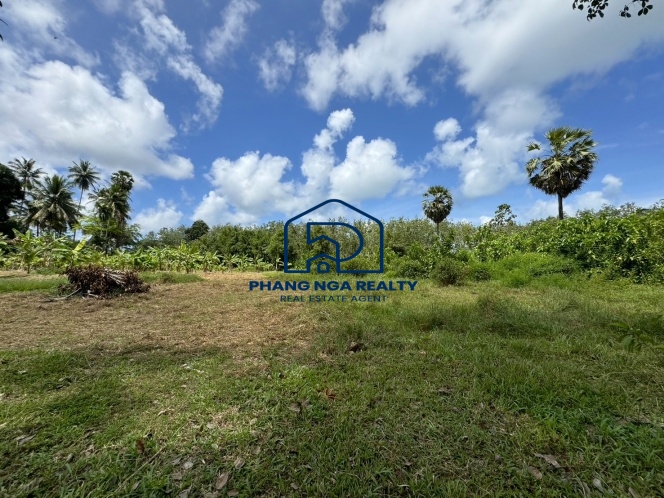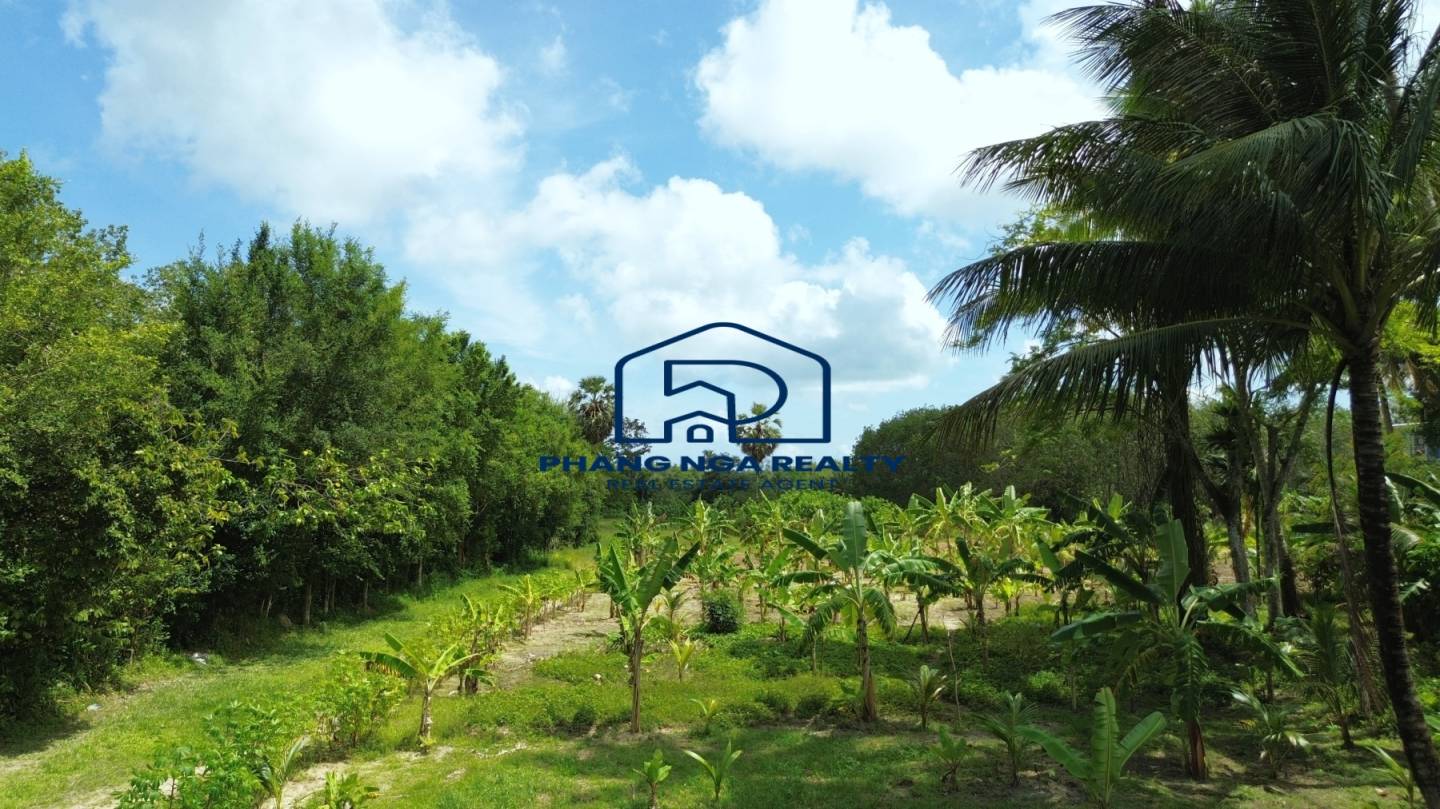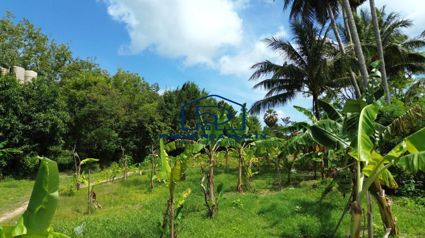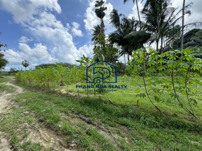 This 5-rai land in Pa Khlok, Phuket, features flat terrain with a wide frontage on a public concrete road and an 8-meter-wide dirt road running along its length. Located in Pa Khlok, Phuket, a well-equipped community with markets, shops, and tranquil surroundings, this land is ideal for building a residence or investing in property development. The land is planted with banana trees, palm trees, and cassava, offering stunning mountain views on both sides, characteristic of Pa Khlok, Phuket.
