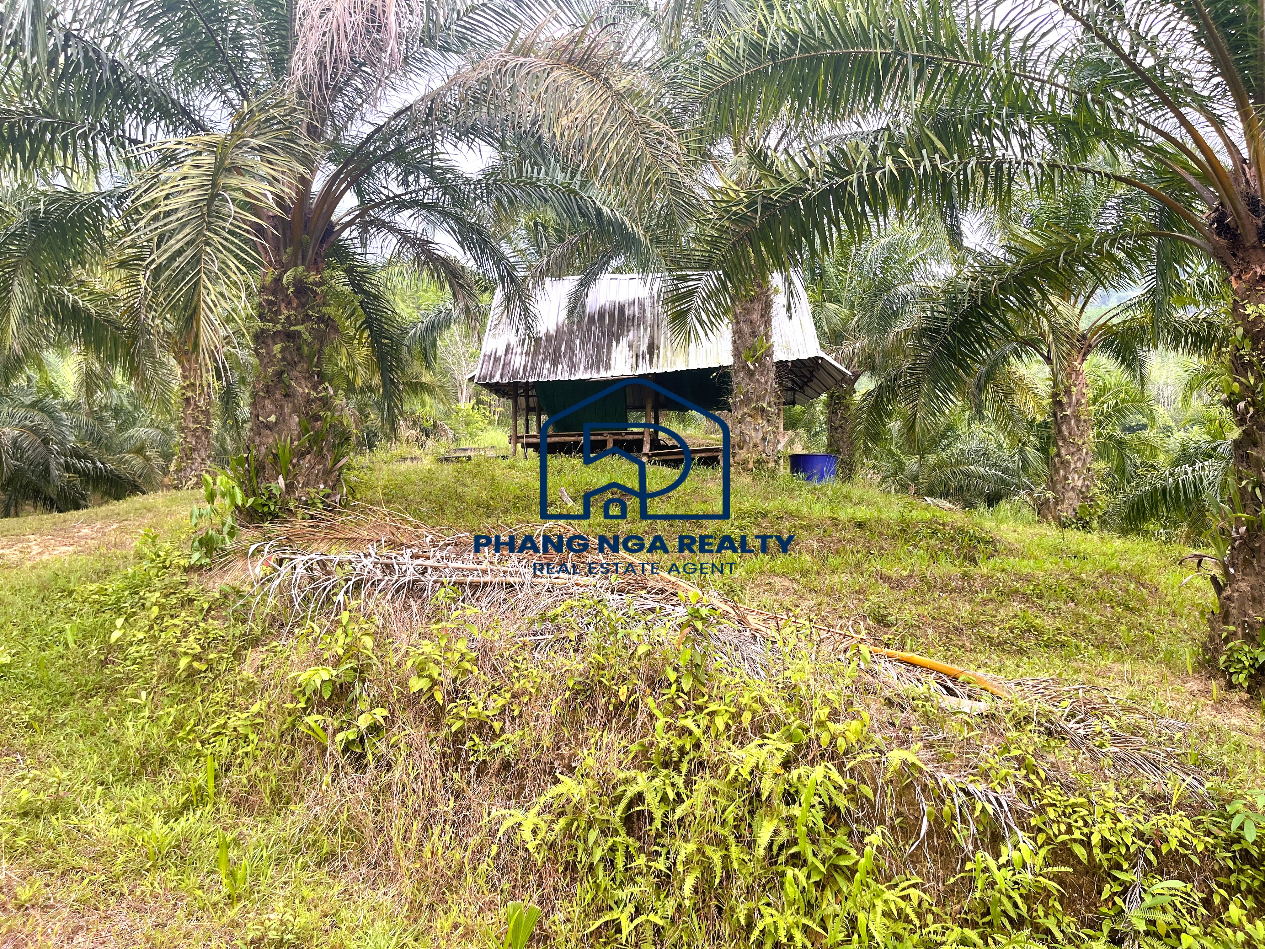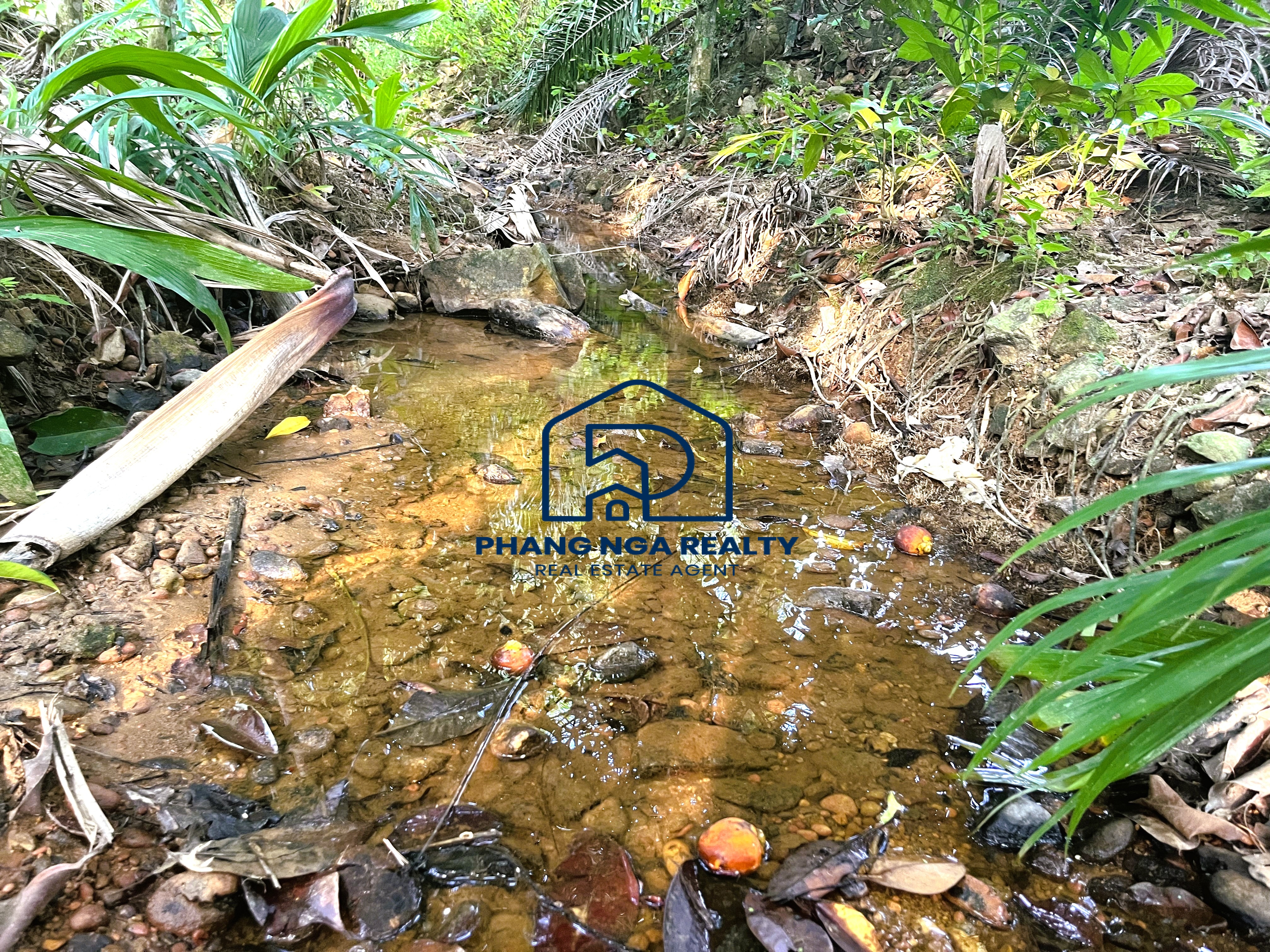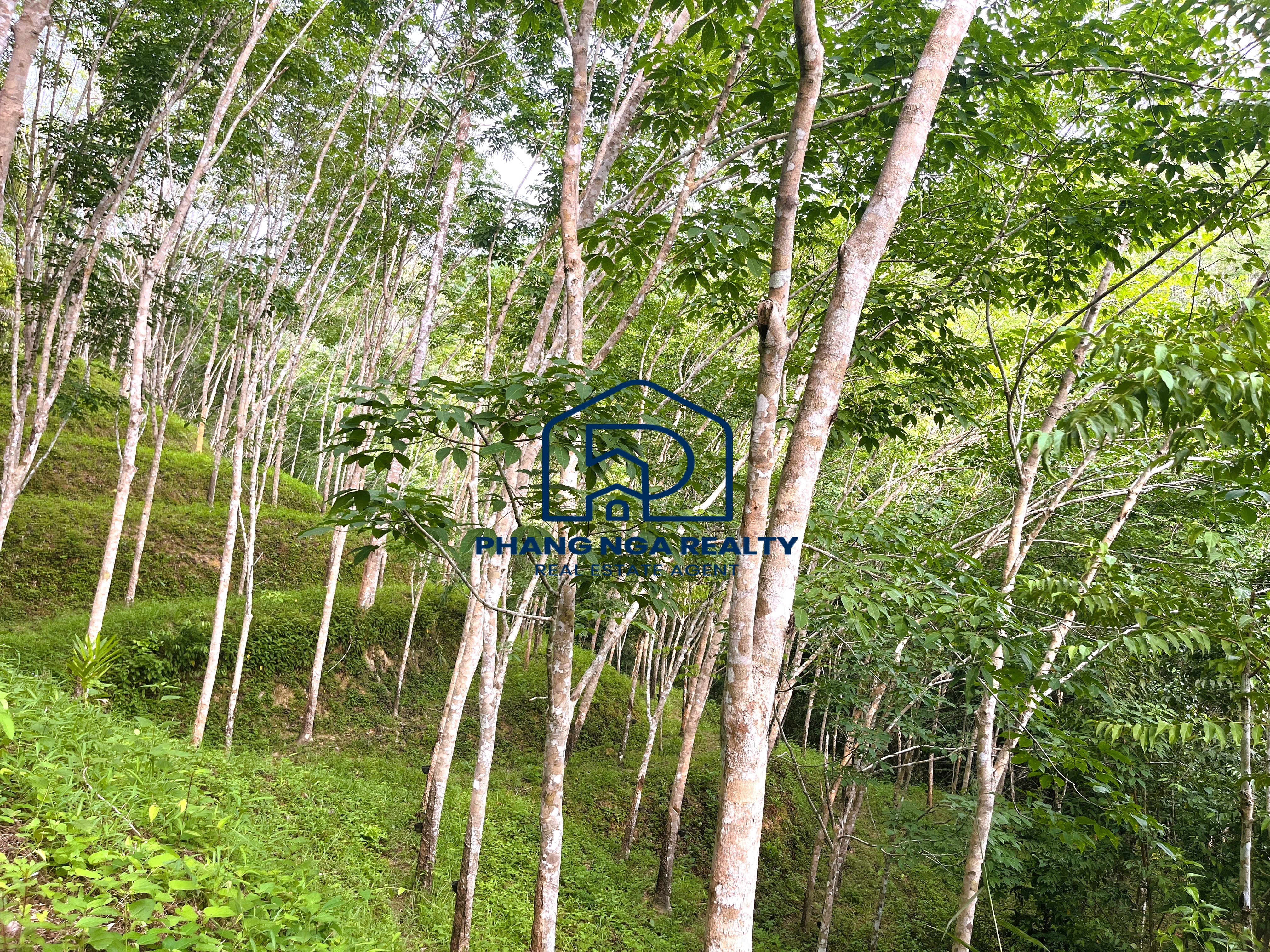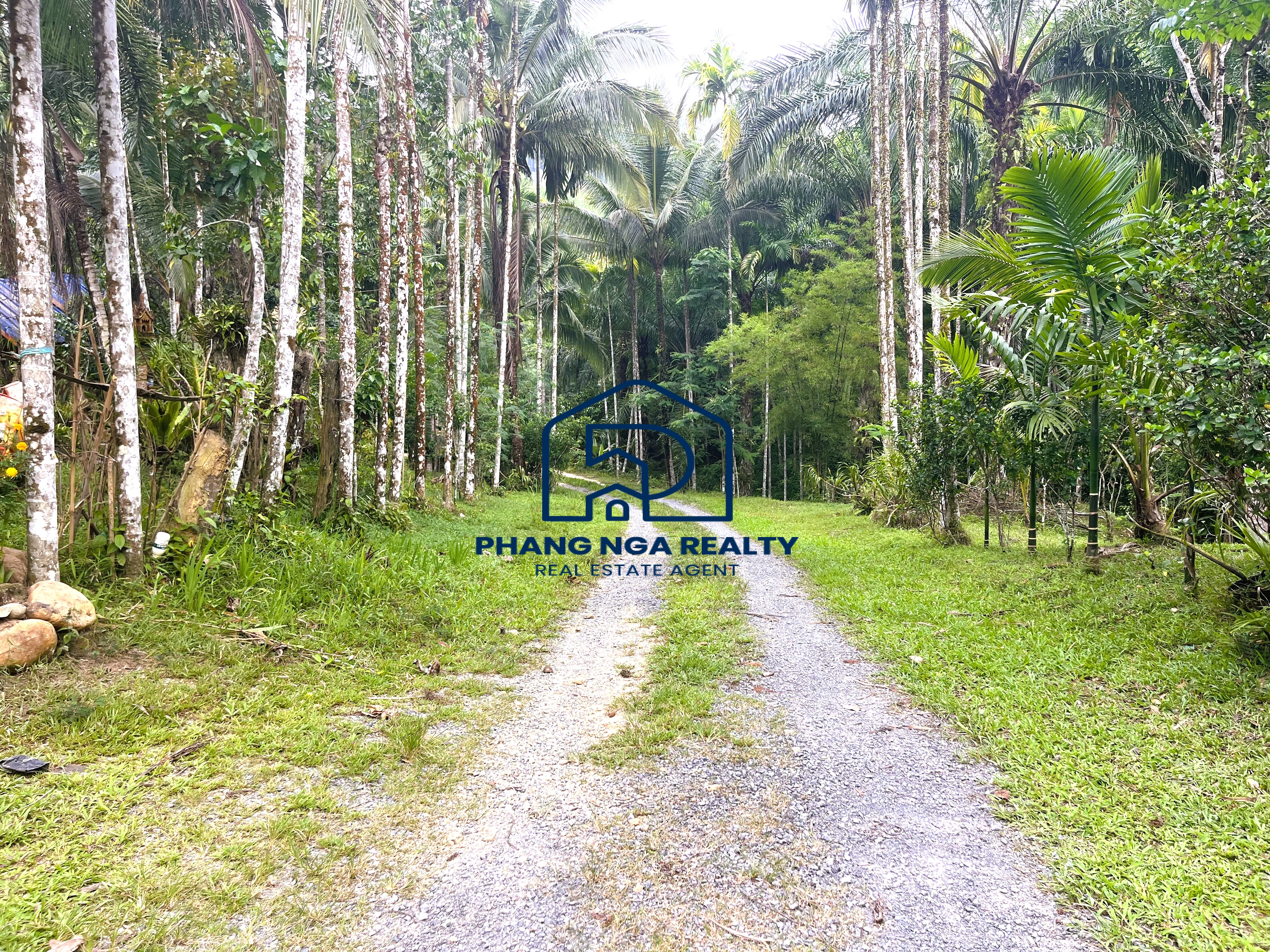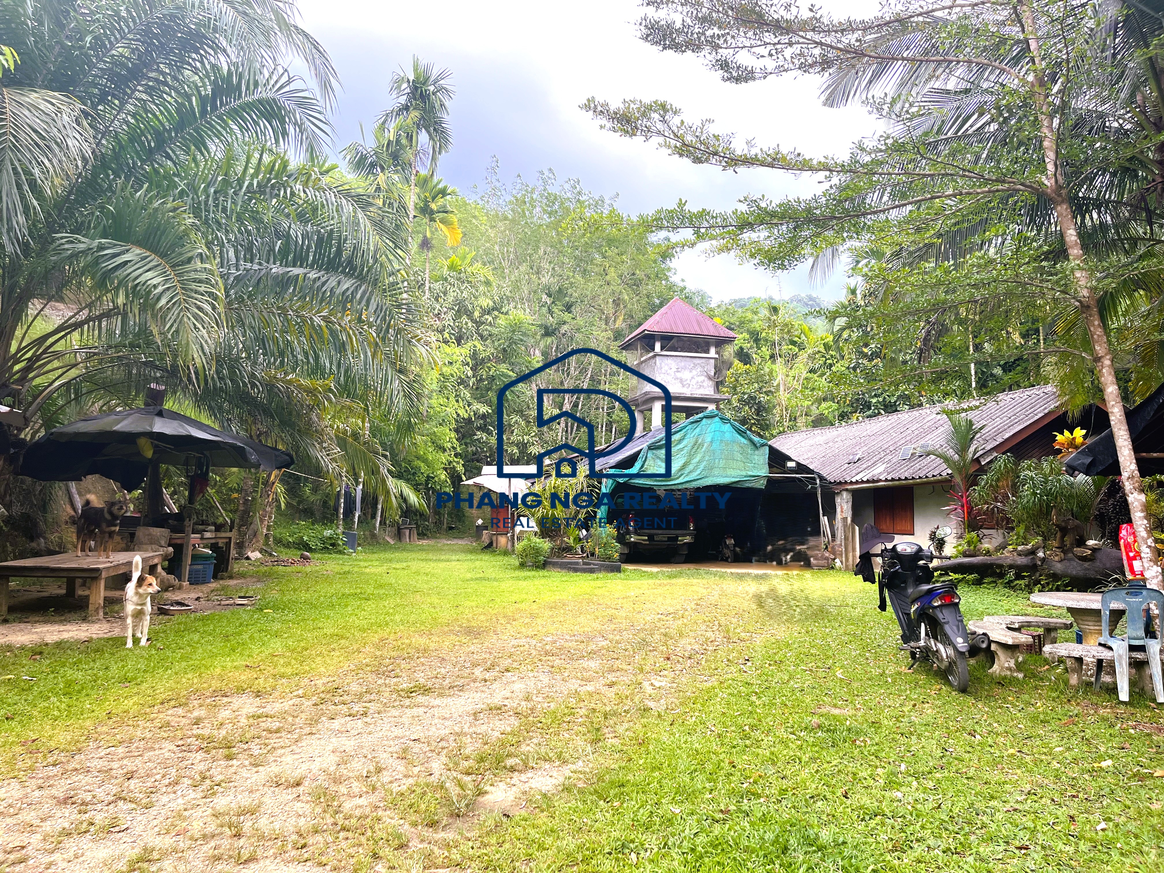 Nearly 25 rai of land with mountain view, farmhouse & public creek for sale in Thai Mueang, Phangnga. An excellent opportunity to own nearly 25 rai of scenic land with a farmhouse, mountain view, and access to a public creek in the peaceful and green surroundings of Thai Mueang, Phangnga. The land features flat and gently sloping areas, with three access roads. It's currently used for rubber plantations (around 3,000 trees) and over 200 palm trees. The property also includes a variety of fruit trees such as mangosteen, langsat, bitter bean (sator), lime, santol, and niang, plus garden vegetables along the fence. A simple farmhouse powered by solar energy is located on-site, with a public creek running along the property’s edge, enhancing the property's natural appeal. With two Chanote title deeds and an additional 2 rai with usufruct documentation, this land is ideal for establishing an organic farm, eco-friendly resort, homestay, or a tranquil private home in beautiful Thai Mueang, Phangnga.