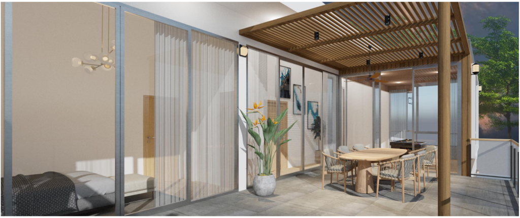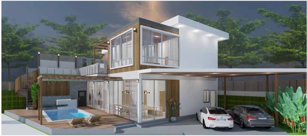 ตั้งอยู่บนที่ดินขนาด 77 ตารางวา พื้นที่ใช้สอยรวม 350 ตารางเมตร มีที่จอดรถ 2 คัน และมี สระว่ายน้ำระบบเกลือพร้อมน้ำตกขนาด 3.5 × 7 เมตร เพิ่มความเป็นส่วนตัวและบรรยากาศพักผ่อนแบบพูลวิลล่าในบ้านของคุณเอง